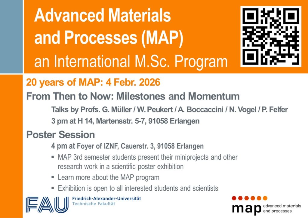 On 4 February 2024, the Master’s program “Advanced Materials and Processes” (MAP) will hold its annual Poster Session. It offers an excellent opportunity for Bachelor students in their fourth semester or above to learn about the MAP Master’s program first-hand. They can get in touch directly with MAP students and staff.